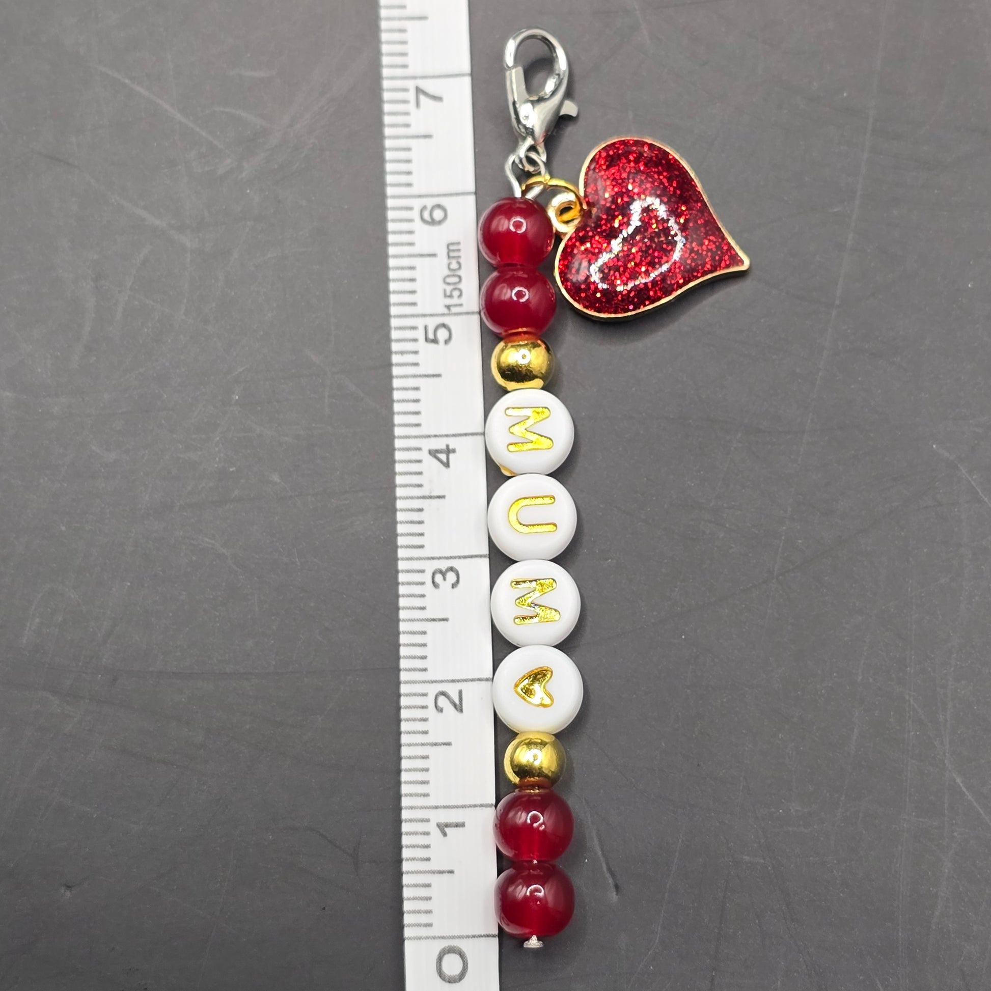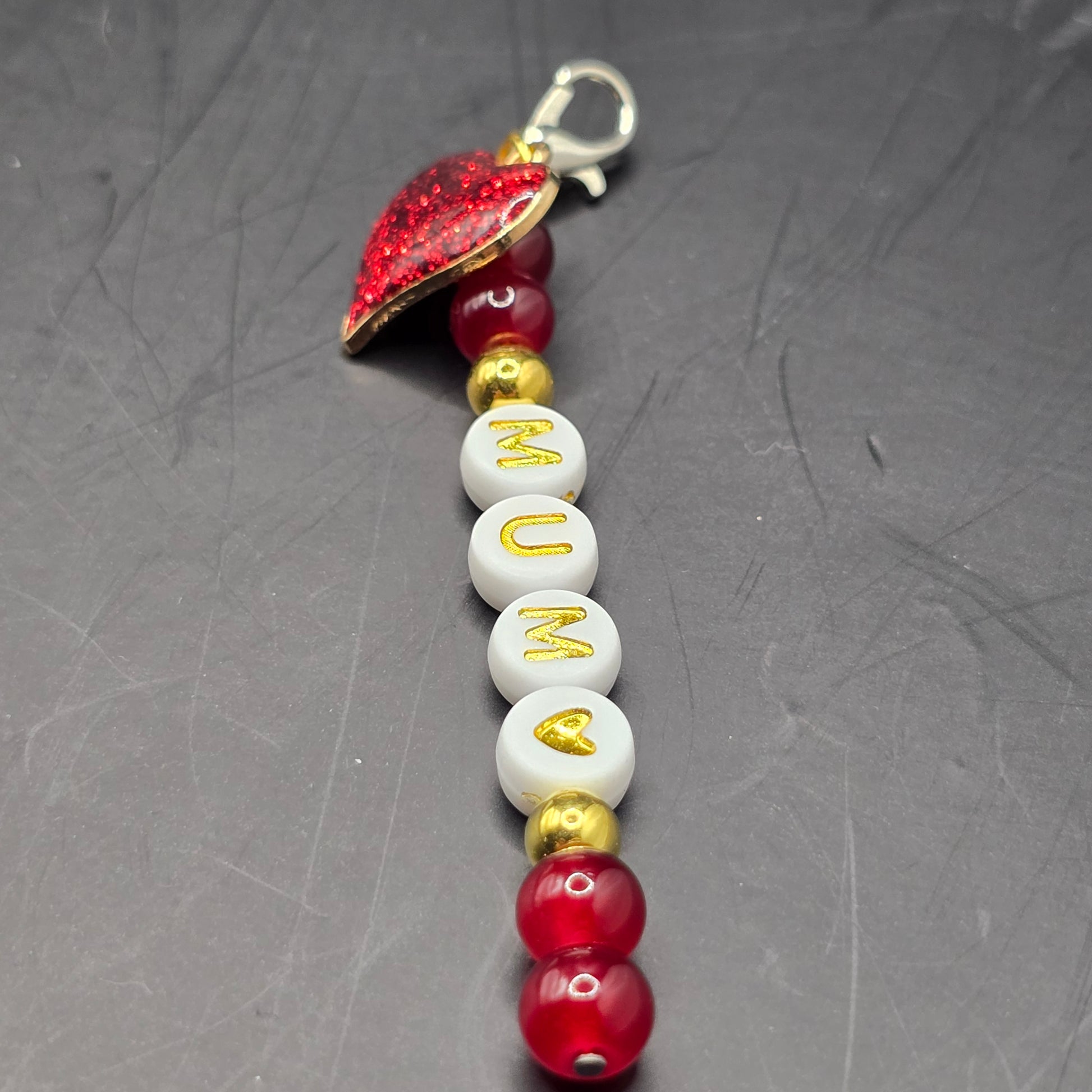 - Text: The beads clearly spell out "MUM" followed by a dainty gold heart symbol.